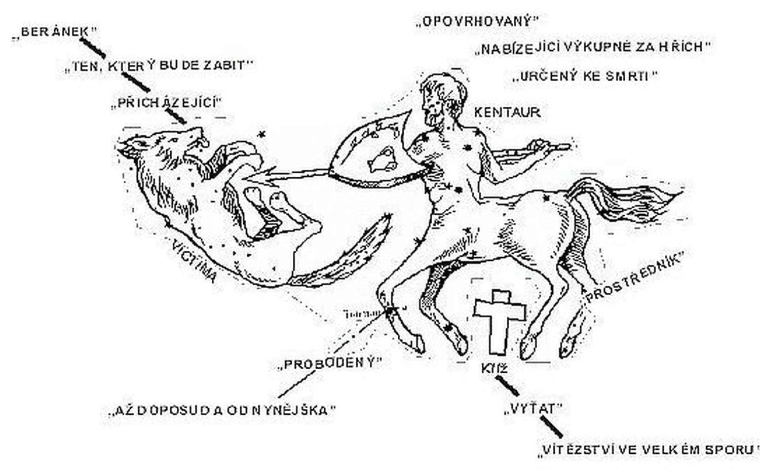 Najjasnejšia hviezda, viditeľná na prednej nohe Kentaura, sa nazýva Toliman, čo znamená „odteraz a naveky“, teda „večný“. Je známa aj ako Cheiron (G), čo znamená „prebodnutý“. Hviezda Pholas znamená „prostredník“. Vidíme tu obraz večnej bytosti dvojitej podstaty – Boha a človeka v jednej osobe – opovrhovaného ľuďmi (Iz 53:3), prinášajúceho výkupné za hriech (v. 10), ktorý bude prebodnutý. Tento „určený“ bol ustanovený, aby ponúkol seba ako obeť a stal sa prostredníkom medzi Bohom a človekom.